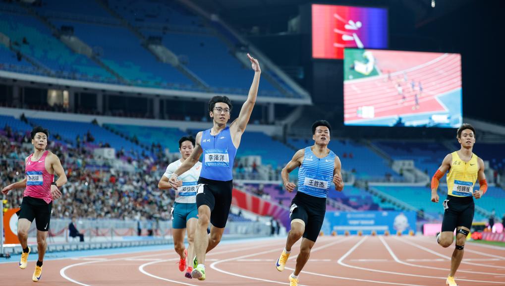 11月17日,第十五屆全國運動會田徑男子100米決賽在廣州舉行,湖北隊選手李澤洋(左三)在沖線后慶祝奪冠。新華社記者 黃偉 攝