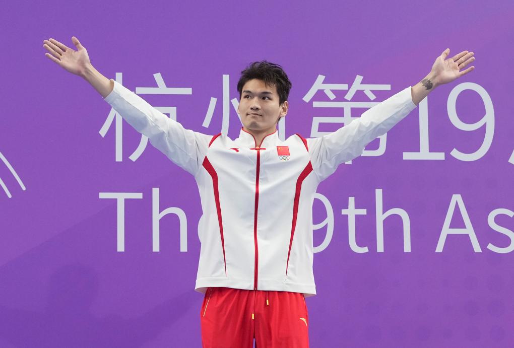 2023年9月29日,冠軍中國選手徐嘉余在杭州亞運會男子200米仰泳決賽頒獎儀式上。新華社記者 杜宇 攝