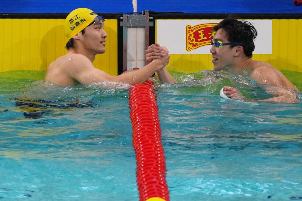 2025年11月17日,浙江隊選手徐嘉余(左)和湖北隊選手王梓成,在第十五屆全國運動會游泳男子50米仰泳決賽后握手致意,他們分別獲得冠軍、亞軍。 新華社記者 夏一方 攝