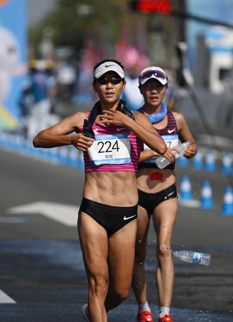 11月12日,第十五屆全國運動會田徑項目女子20公里競走決賽在廣東珠海舉行,廣東隊選手劉虹(左)在比賽中。新華社記者 連振 攝