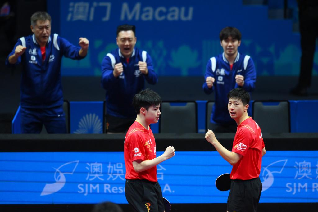 2025年11月18日,第十五屆全國運動會乒乓球男子團體半決賽中,北京隊組合馬龍(右)/黃友政在男雙比賽中慶祝。 新華社發(張金加攝)
