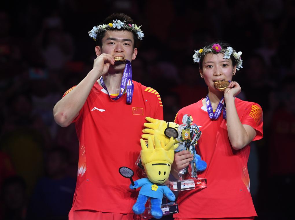 2018年8月5日,鄭思維(左)和黃雅瓊在世界羽毛球錦標賽混雙決賽中奪冠。新華社記者 季春鵬 攝