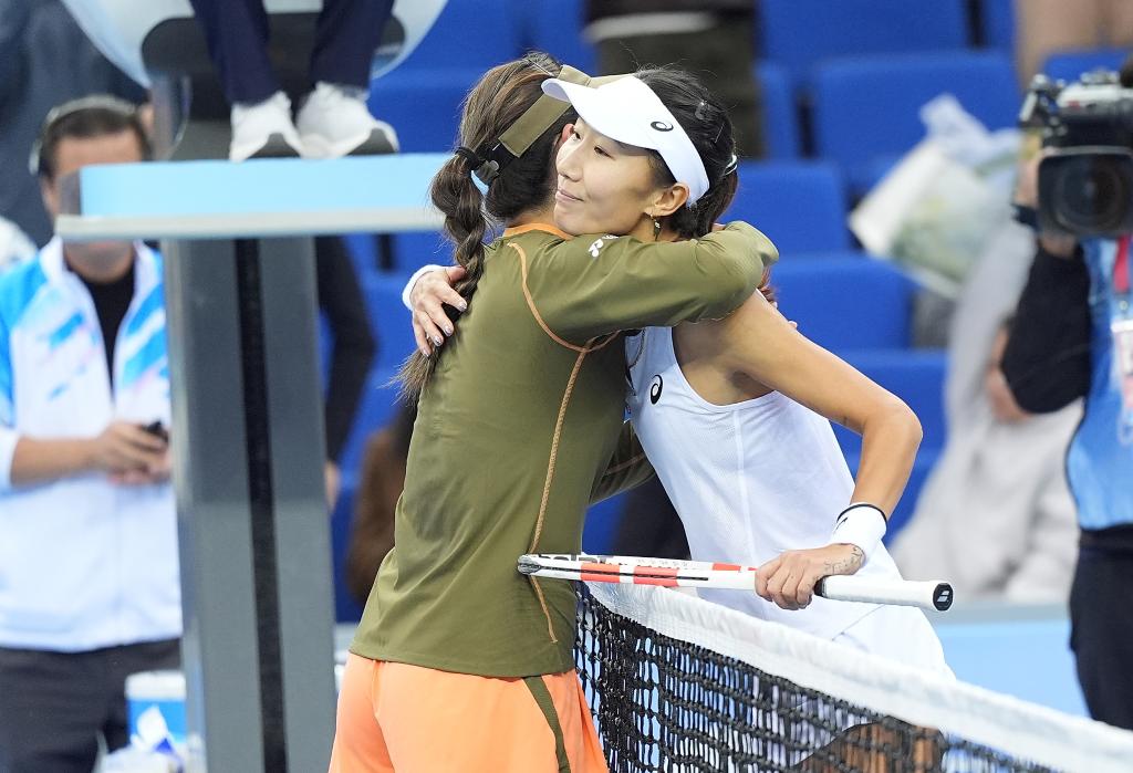 11月20日,全運會網球項目女子單打決賽后,安徽隊選手朱琳(左)與北京隊選手高馨妤擁抱致意。新華社記者 顏麟蘊 攝