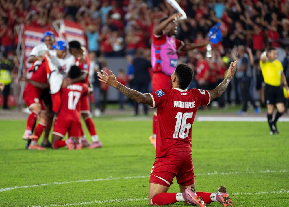 11月18日,巴拿馬隊球員安德烈斯·安德拉德(前)慶祝比賽勝利。新華社記者 許詠政 攝