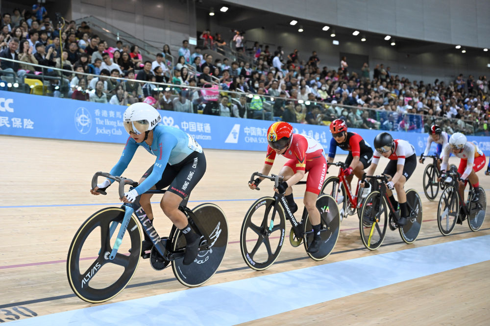 ↑11月17日,冠軍香港隊選手李思穎(左一)在場地自行車女子全能賽記分賽中。