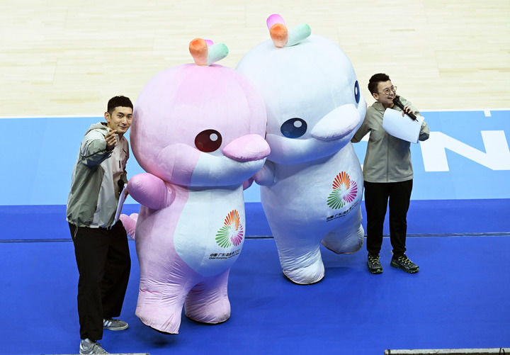 ↑11月11日,在香港舉行的第十五屆全國運動會籃球男子22歲以下組小組賽中,現場主持人在比賽間隙帶著吉祥物與觀眾互動。