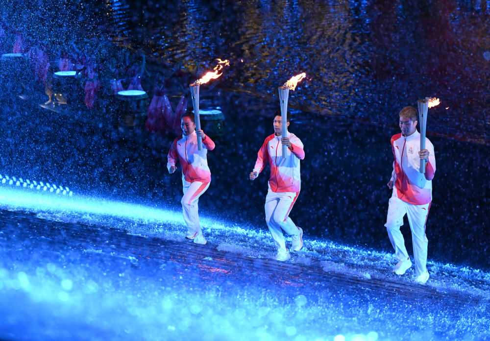 ↑11月9日,火炬手蘇炳添(中)、張家朗(右)、李祎在開幕式現場跑向主火炬。