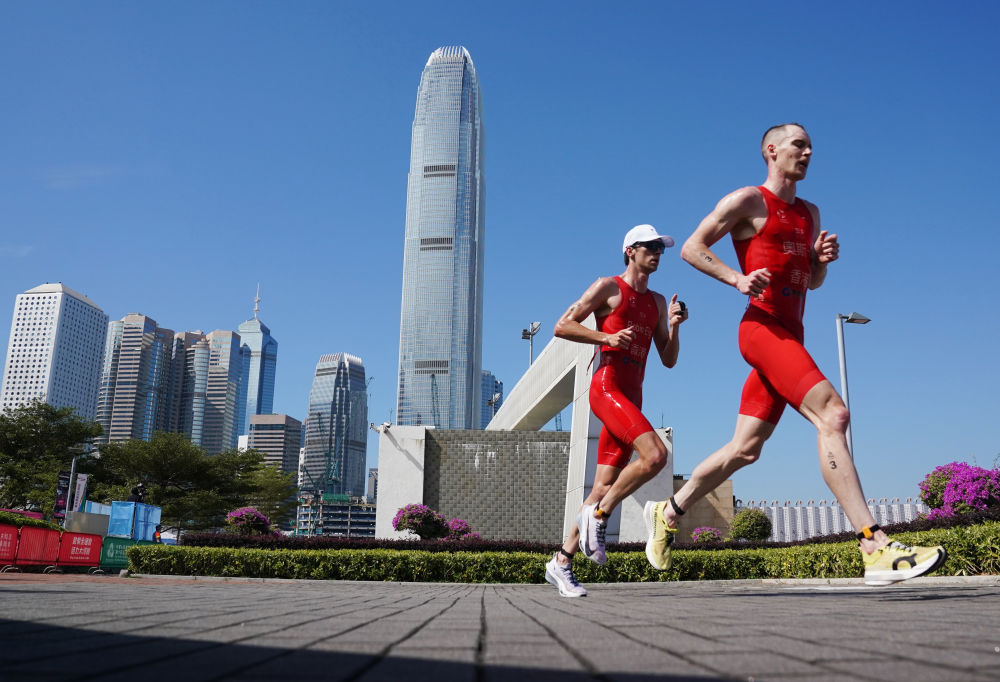 ↑11月15日,香港隊選手奧斯卡(右)在鐵人三項男子個人比賽中。