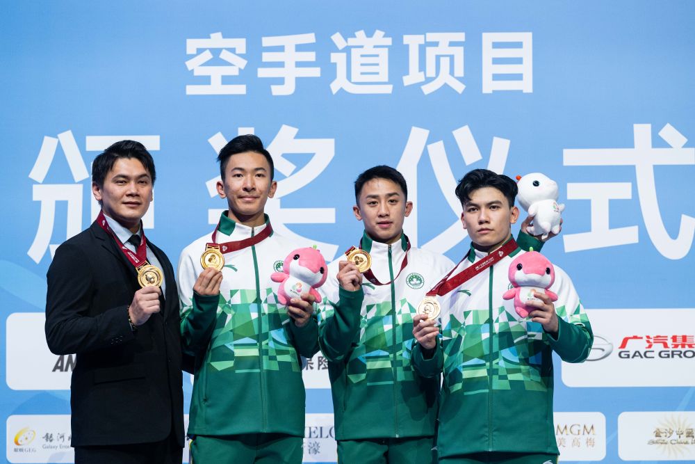 ↑11月6日,冠軍澳門隊在空手道男子業余組團體型決賽頒獎儀式上。