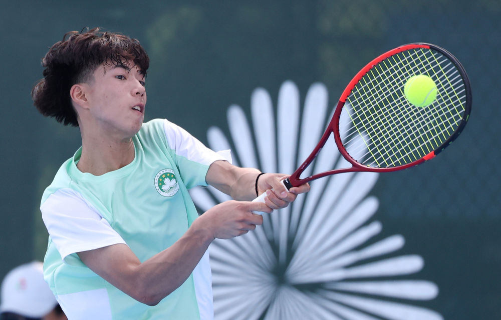 ↑11月9日,澳門隊選手何鍶朗在網球青年組男子團體第1輪單打比賽中回球。