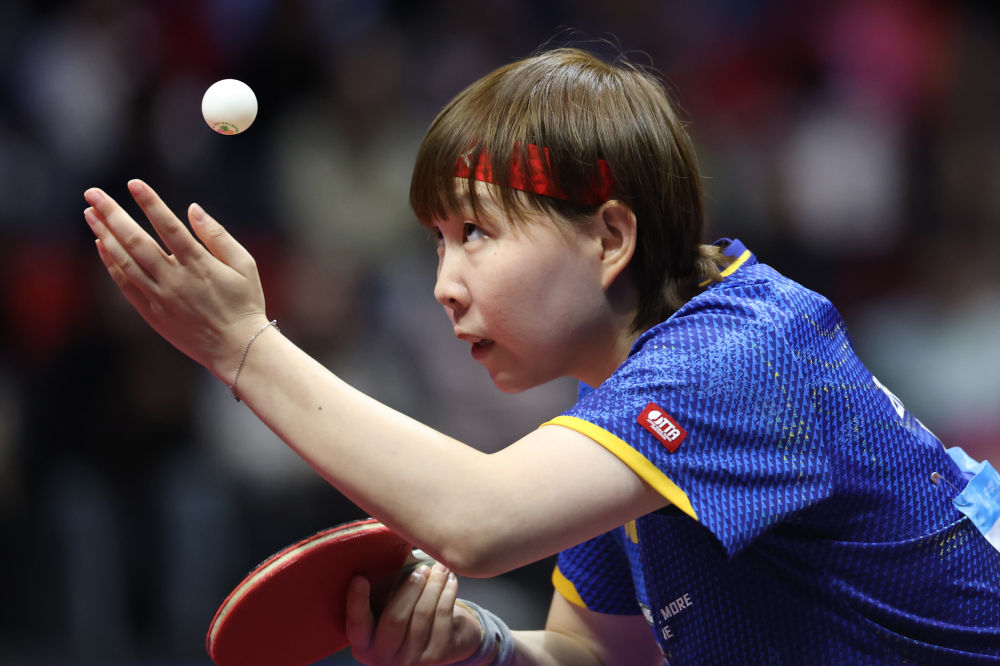 ↑11月16日,澳門隊選手朱雨玲在乒乓球女子單打銅牌賽中發球。