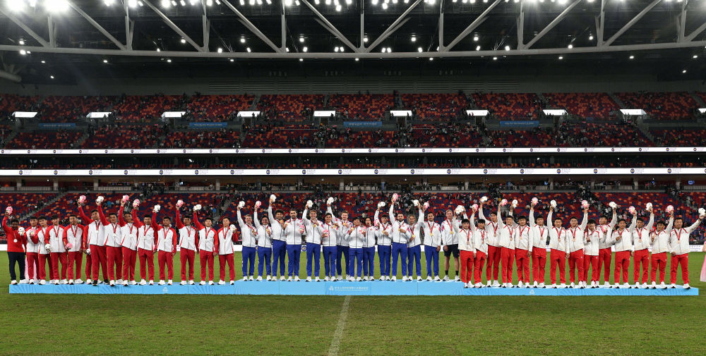 ↑11月14日,冠軍香港隊(中)、亞軍山東隊(左)、季軍北京隊(右)在7人制橄欖球男子頒獎儀式上合影。