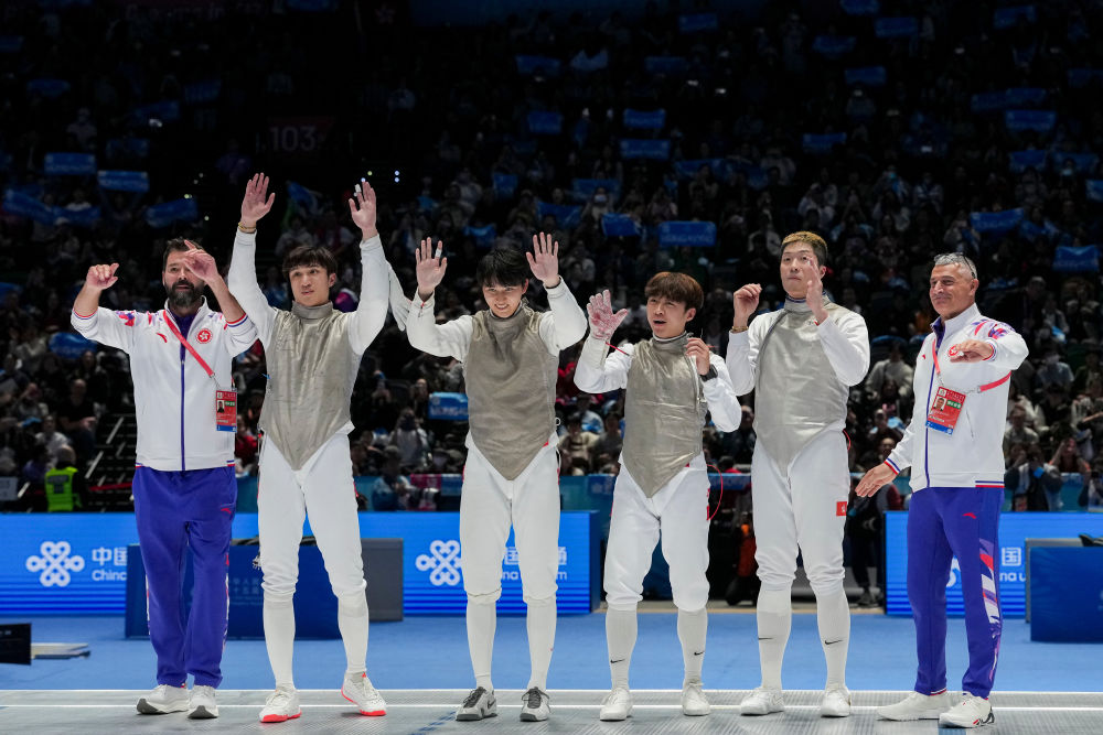 ↑11月19日,香港隊選手和教練在男子花劍團體金牌賽奪冠后向觀眾致意。