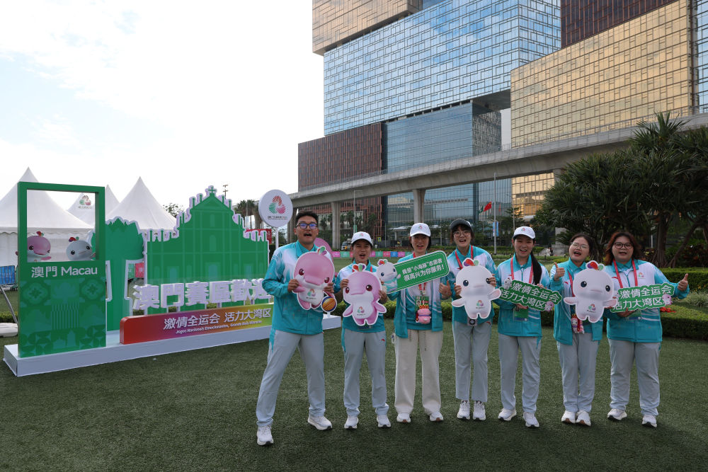 ↑11月15日,澳門賽區志愿者在比賽場地所在的澳門永利皇宮南門戶外草坪迎接觀眾到來。