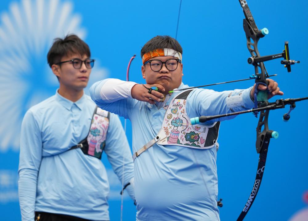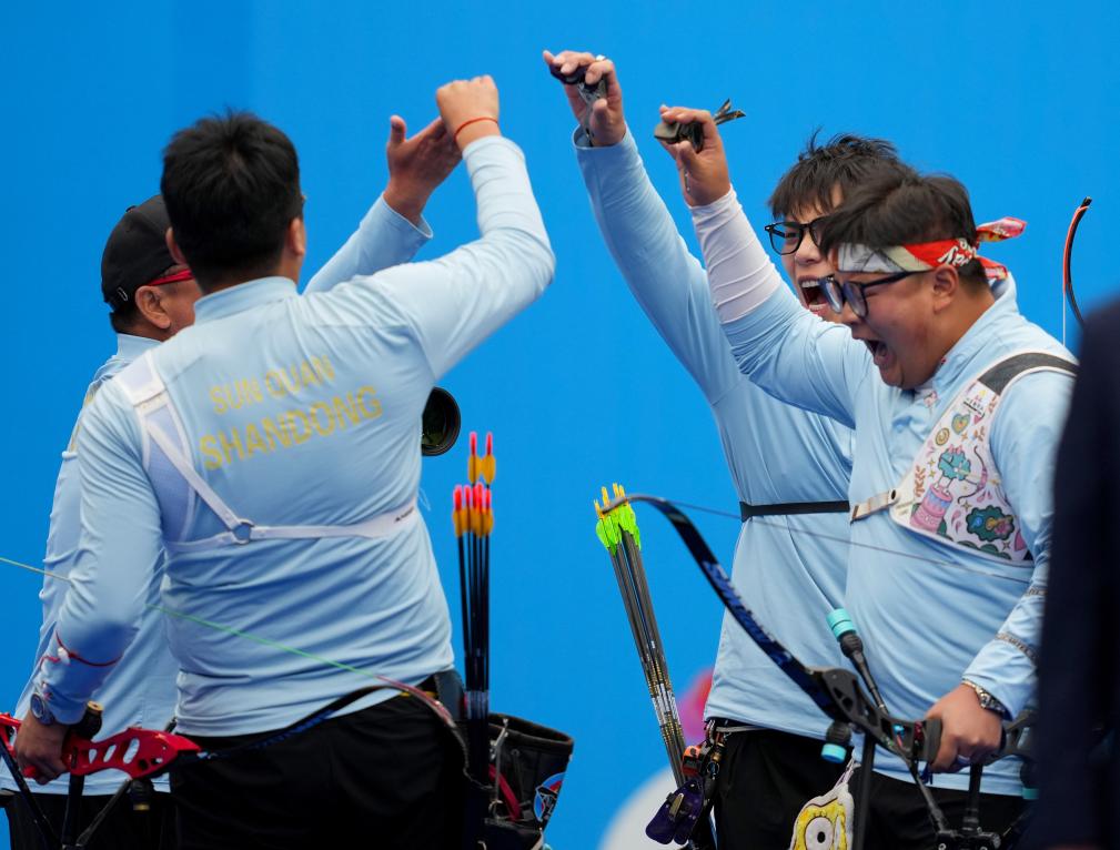 自信的不止是李夢麒。決賽第二局,比賽緊張到令人窒息,全場觀眾鴉雀無聲。山東隊馮浩箭剛離弦,他就大喊一聲“漂亮”,聲音響徹全場。話音剛落,箭頭穩穩扎在了黃心上,“10環!”