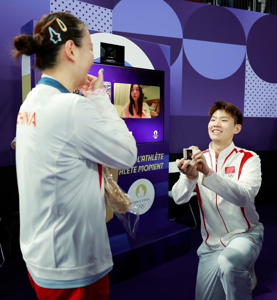 2024年8月2日,劉雨辰(右)向黃雅瓊求婚。新華社記者 任正來 攝