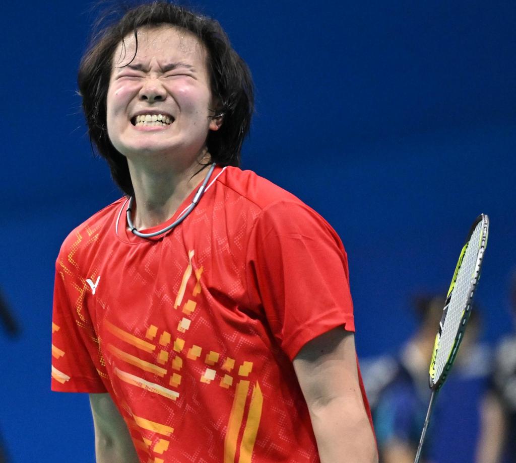 11月16日,江蘇隊選手何冰嬌在全運會羽毛球女單八分之一決賽中。新華社記者 李賀 攝