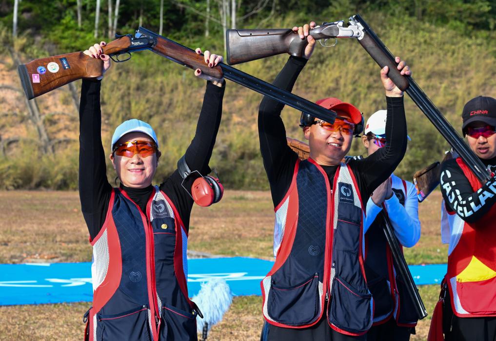 第十五屆全國運動會射擊飛碟項目多向混合團體決賽20日在廣州飛碟訓練中心展開角逐。由上屆全運會多向男、女冠軍“聯手出戰”的湖南隊郭雨浩/劉英姿以44中奪得冠軍,陜西隊肖金佳/段宇薇以42中摘得銀牌,山東隊于海成/柳珊珊獲得第三名。