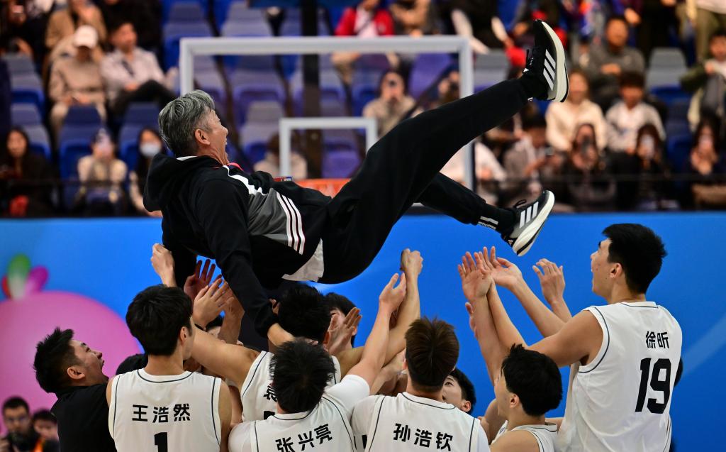 11月20日,廣東隊球員將主教練鄭永剛拋起慶祝奪冠。新華社記者 于洋 攝