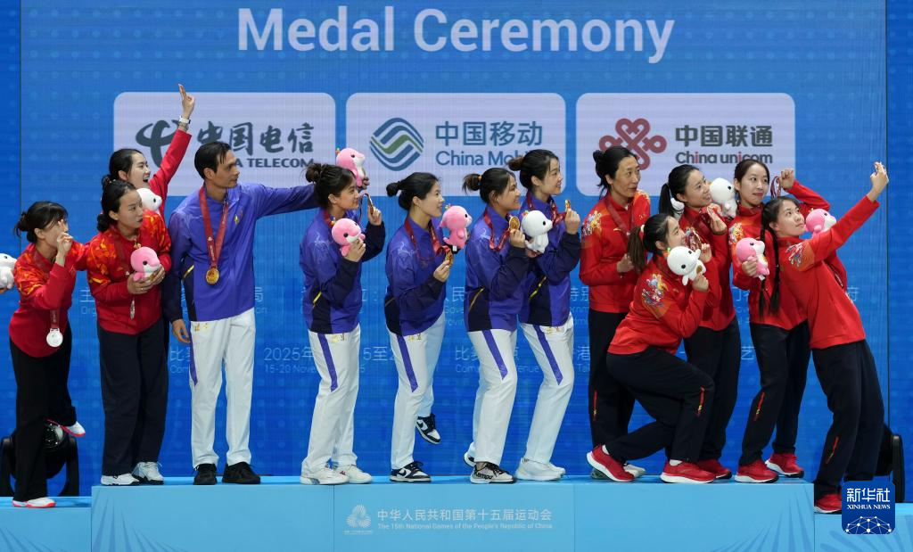 11月20日,獲得冠軍的福建隊成員(中)、獲得亞軍的重慶隊成員(左)、獲得季軍的江蘇隊成員在頒獎儀式上自拍合影。