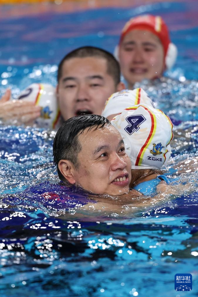 11月21日,上海隊主教練李文華(前)在泳池中慶祝。