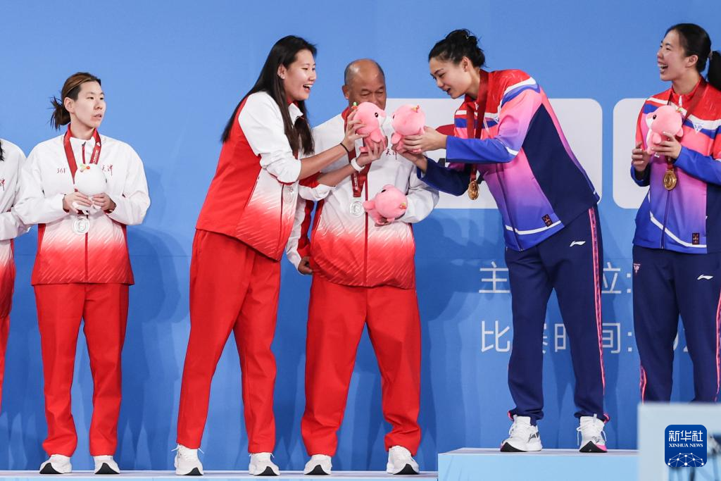 11月21日,天津隊守門員杜馨玥(左二)與上海隊守門員沈軼能(右二)在頒獎儀式中互動。