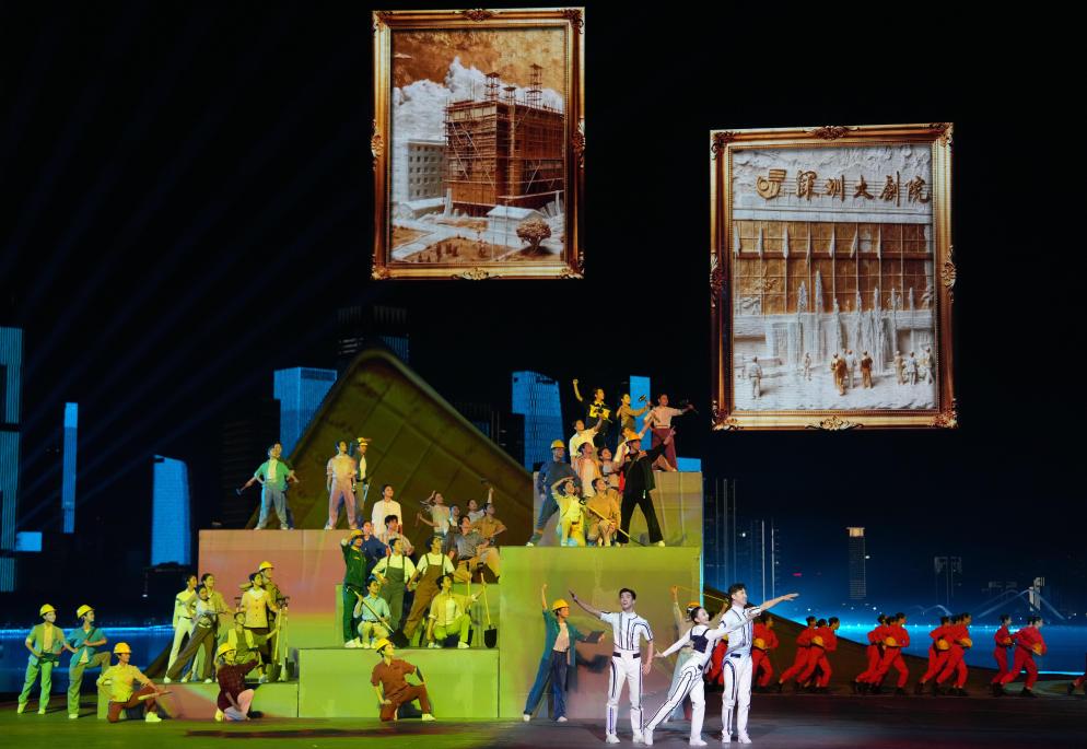 舞臺上,象征改革開放歷程的建設者們接力登場,劈山跨海,筑路架橋。他們帶著夢想南下,以敢闖敢試、敢為人先、埋頭苦干的特區精神,闖出一片新天地。