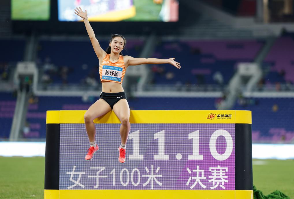 11月17日,浙江隊選手陳妤頡在女子100米比賽后與成績顯示屏合影。她奪得冠軍。新華社記者黃偉攝