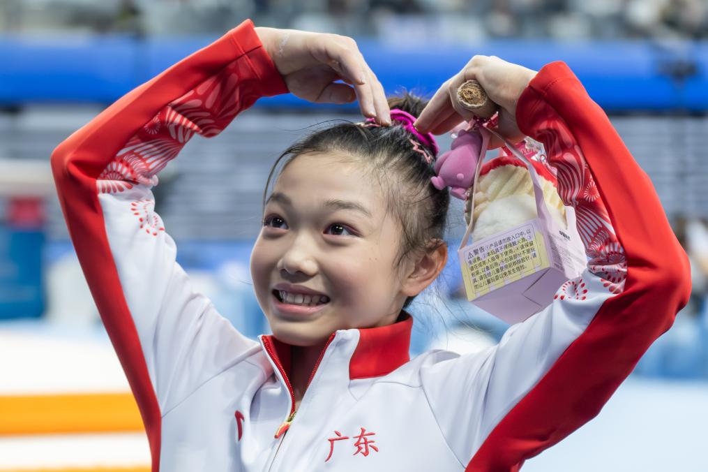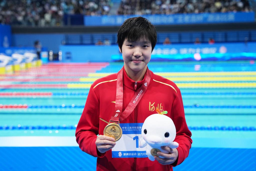 11月17日,女子400米個人混合泳冠軍河北隊選手于子迪在頒獎儀式后。新華社記者杜宇攝