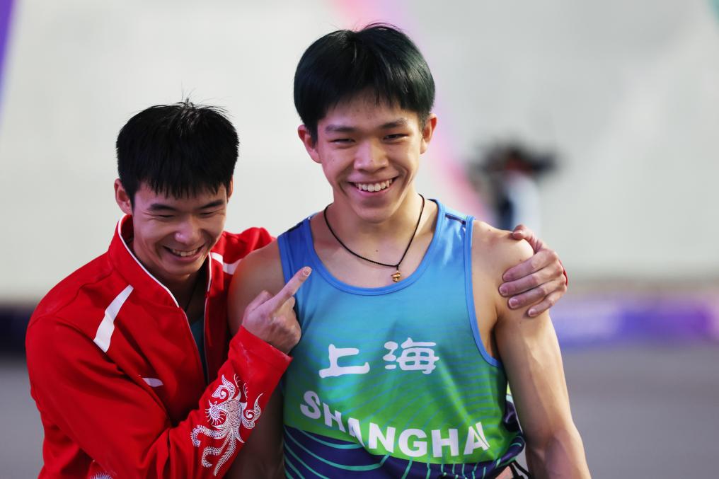 11月14日,上海隊選手趙一程(右)在男子速度攀巖比賽后。新華社記者楊世堯攝