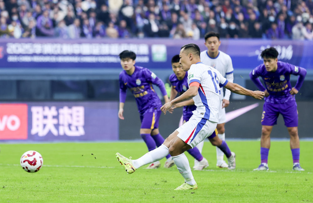 11月22日,上海申花隊球員吳曦(前)點球破門。當日,在天津舉行的2025賽季中國足球超級聯賽第30輪比賽中,上海申花隊客場3比1戰勝天津津門虎隊。新華社記者 孫凡越 攝