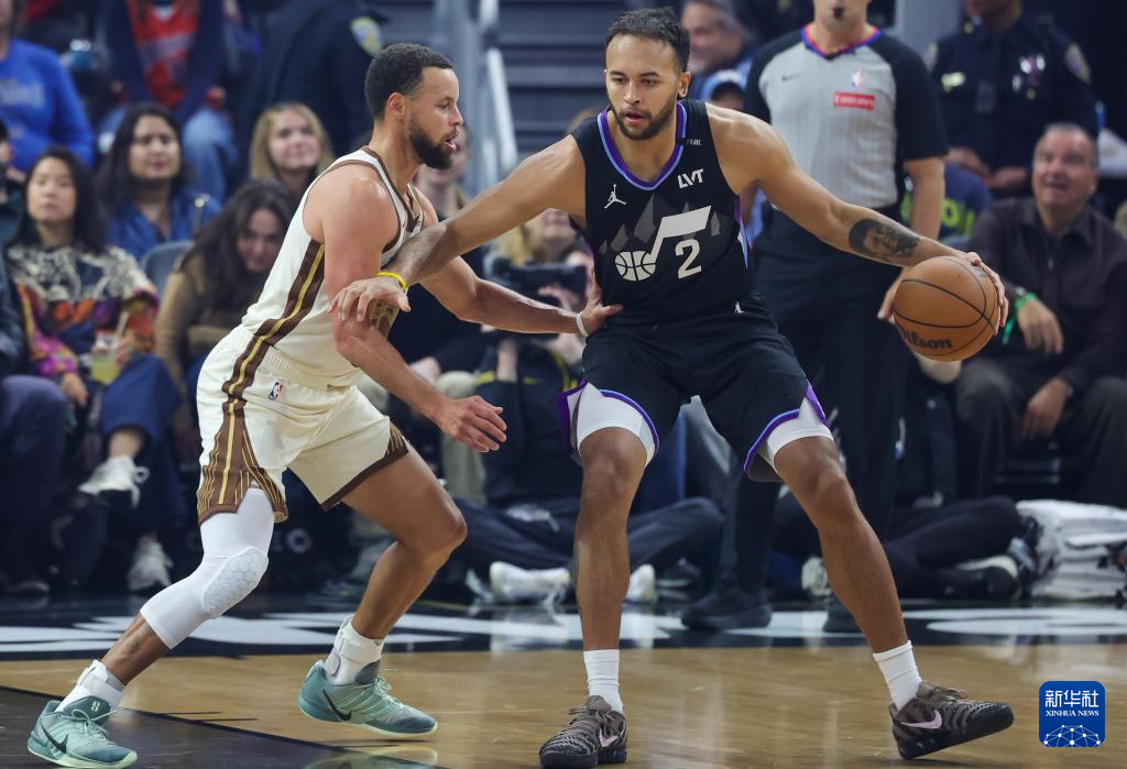 11月24日,勇士隊球員庫里(左)防守爵士隊球員李凱爾。