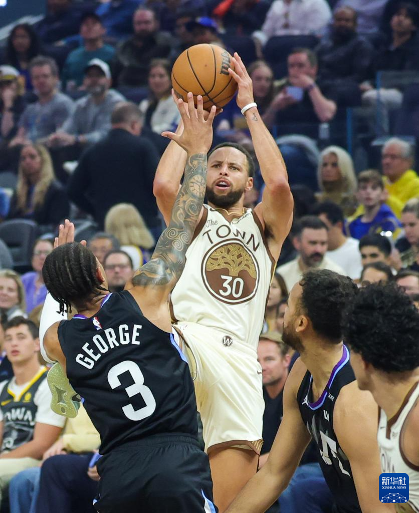 11月24日,勇士隊球員庫里(上)在比賽中投籃。