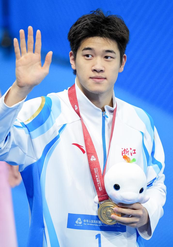 11月14日,第十五屆全國運動會男子100米自由泳決賽賽后,冠軍浙江隊選手潘展樂向觀眾致意。新華社記者 夏一方 攝