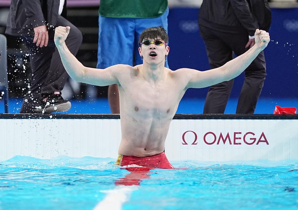 2024年7月31日,潘展樂在巴黎奧運會男子100米自由泳決賽后慶祝。新華社記者 杜宇 攝