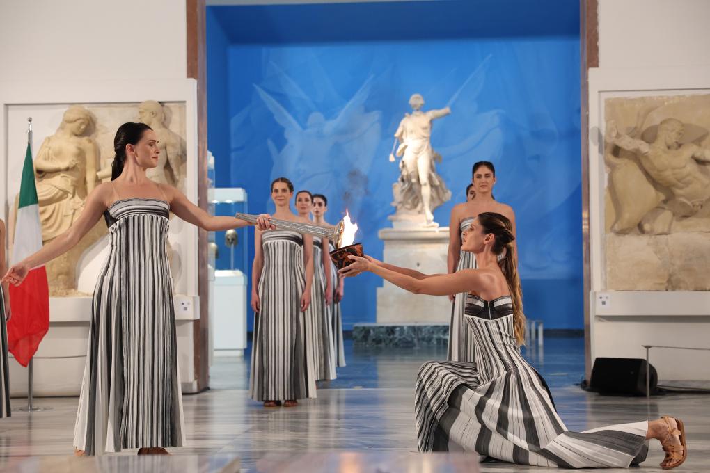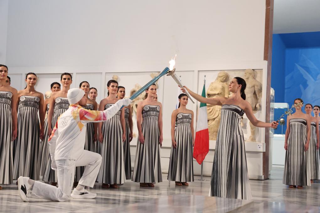 ↑11月26日,第一棒火炬手與扮演最高女祭司的演員瑪麗·米娜交接火炬。新華社記者 李京 攝