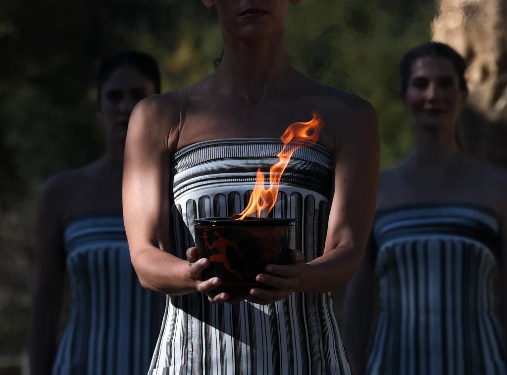 ↑11月24日,一名扮演女祭司的演員手捧火種罐。新華社記者 李京 攝