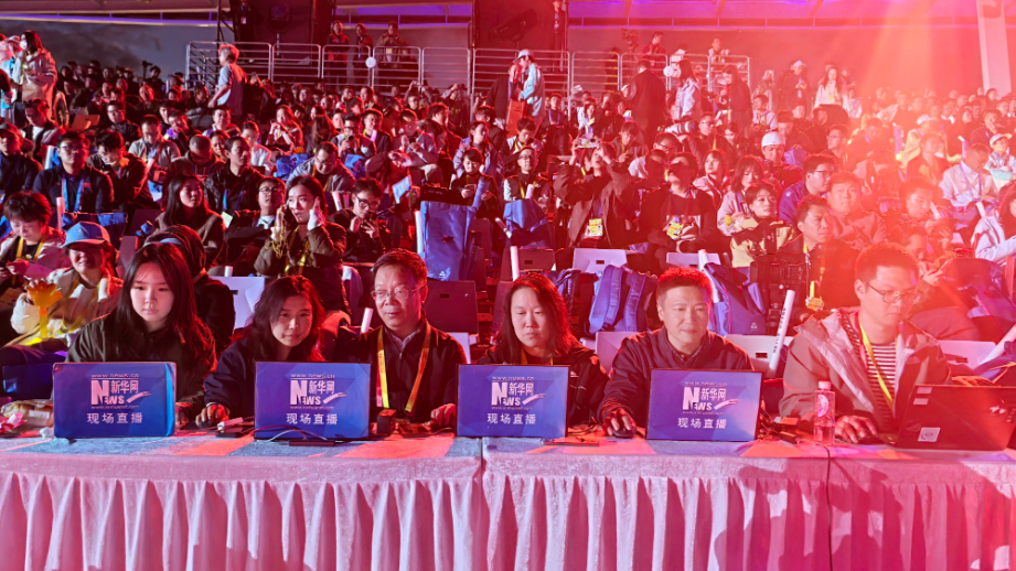 新華網直播團隊在中華人民共和國第十五屆運動會閉幕式現場做好網絡直播準備