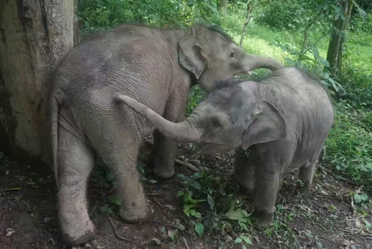 幼年的“羊妞”(右)和“小強”(左)一同在野外活動。新華網發(云南西雙版納國家級自然保護區管護局 供圖)