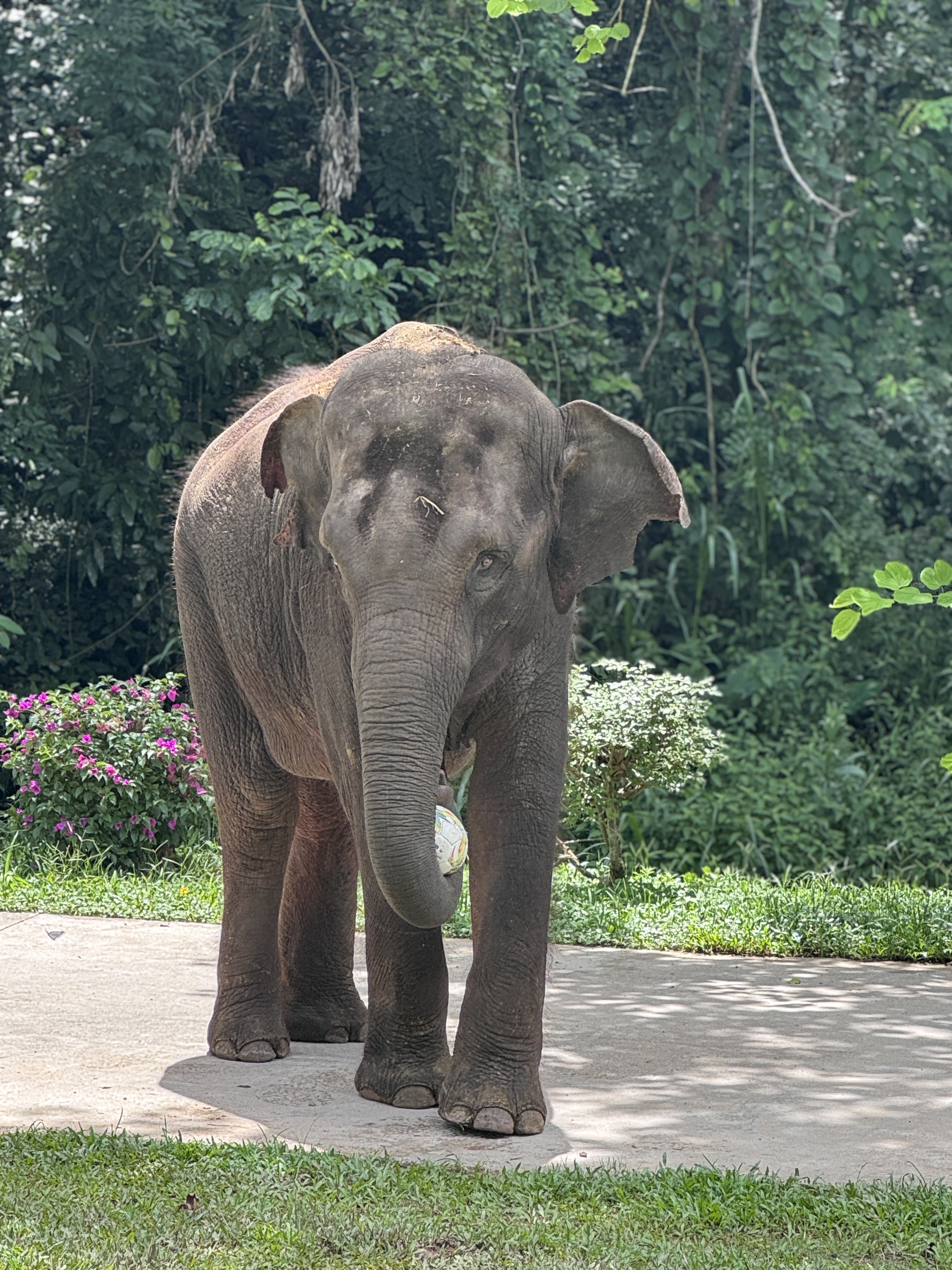 皮球是“羊妞”喜愛的玩具之一,陳繼銘記得“羊妞”剛開始接觸皮球時,還會踢著玩,但玩著玩著就開始“耍賴”——用鼻子抱著球跑,“象爸爸”想直接把球收回來是不可能的。這該如何是好?面對“吃貨”,當然要用對付“吃貨”的辦法。只要拿起奶瓶,“羊妞”便會迅速放下皮球,但聰明的它不會一直被“套路”,發現奶瓶里沒有奶后,“象爸爸”要用胡蘿卜才能換回皮球。