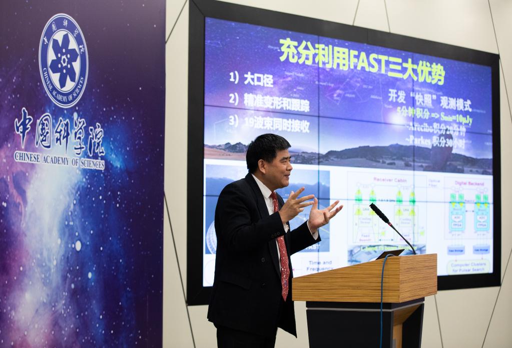 1月5日,在中科院國家天文臺舉行的新聞發布會上,國家天文臺韓金林在介紹FAST在脈沖星搜尋方面的重要進展。新華社記者 金立旺 攝