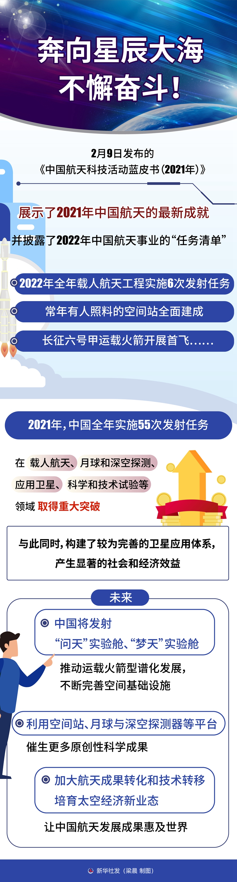 2022年全年載人航天工程實施6次發射任務,常年有人照料的空間站全面建成,長征六號甲運載火箭開展首飛……9日發布的《中國航天科技活動藍皮書(2021年)》,展示了2021年中國航天的最新成就,并披露了2022年中國航天事業的“任務清單”,一項項舉世矚目的成就和新計劃催人奮進。
