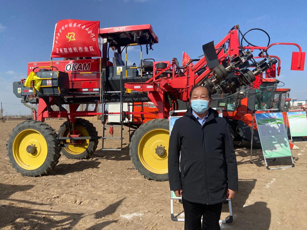 呂國斌和他購買的制種玉米去雄機合影。新華社記者 王朋 攝