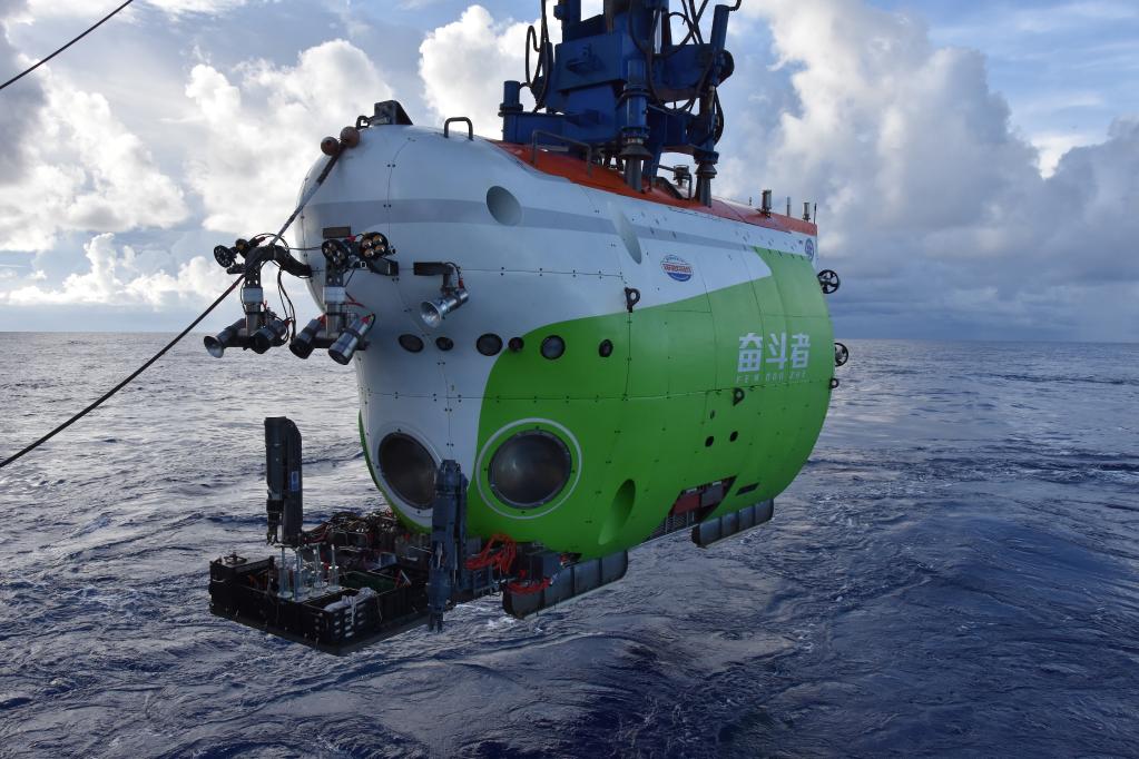 全海深載人潛水器“奮斗者”號在西太平洋即將入水(2021年9月1日攝)。新華社記者 陳凱姿 攝