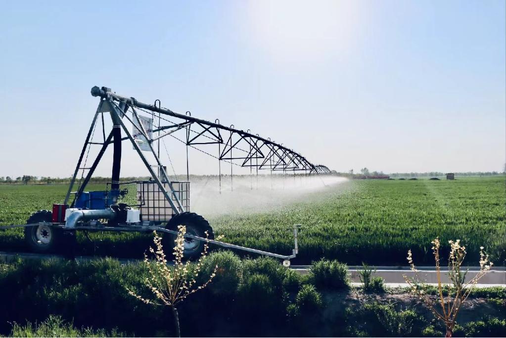 農場智慧云平臺接到這條“急電”,經過十幾秒的自動研判后,向田間自走式水肥一體噴灌機發出指令,噴灌機開啟精準澆水作業。
