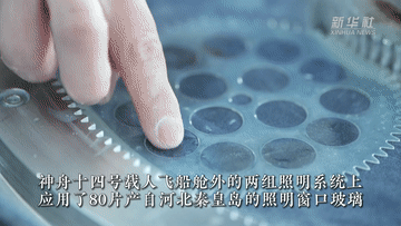 神舟十四號載人飛船艙外的兩組照明系統上,應用了80片產自河北省秦皇島市的照明窗口玻璃,它們為航天員出艙活動及飛船的交會對接提供有力保障。
