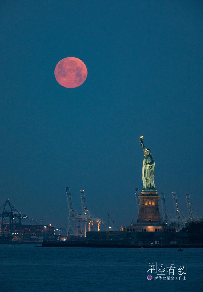 這是2021年5月26日在美國紐約拍攝的自由女神像上空的圓月。當日,年度“最大滿月”恰逢月全食。(新華社記者王迎攝)