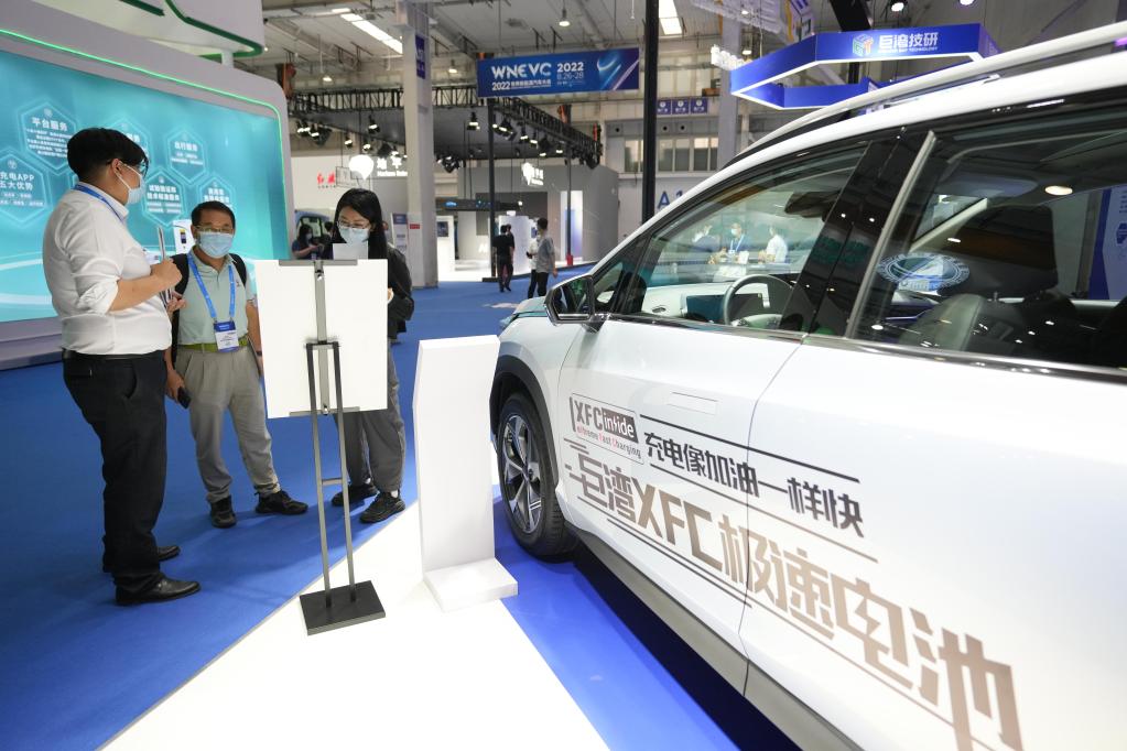 8月26日,2022世界新能源汽車大會上,工作人員向參觀者介紹一款搭載可快速充電電池的新能源汽車。新華社記者 鞠煥宗 攝