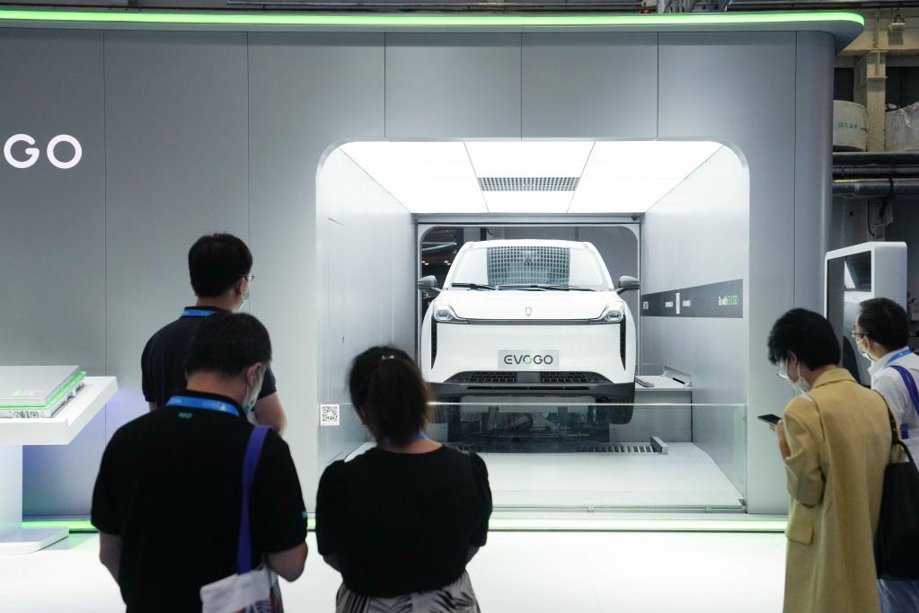 8月26日,2022世界新能源汽車大會上,參觀者在觀看一輛可換電池新能源汽車的換電演示。新華社記者 鞠煥宗 攝