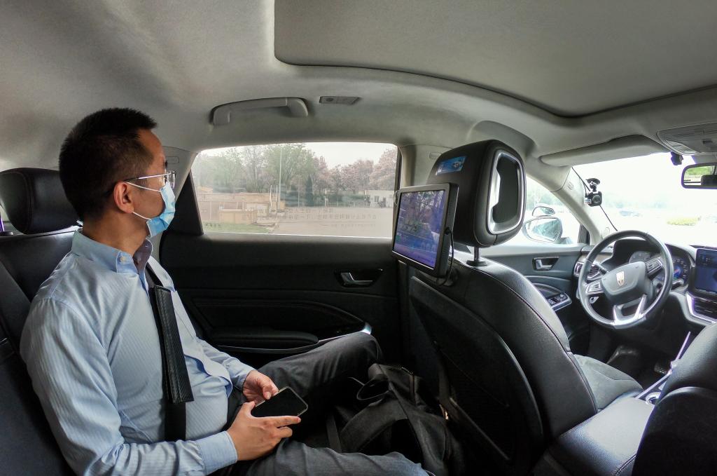 4月25日,在北京經濟技術開發區,一名乘客在體驗“主駕無人、副駕駛配備安全員”的無人駕駛車。新華社記者 彭子洋 攝